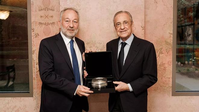 欧冠联赛阶段第三轮,皇家马德里将主场对阵尤文图斯,赛前,两家俱乐部主席出席高层会议,并互赠礼物。
