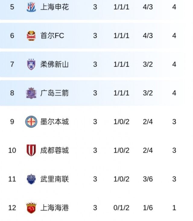 本场比赛结束之后,上海申花三战一胜一平一负,积4分位列第5,暂时处于晋级区内。而成都蓉城一胜两负积3分位列第10,海港一平两负积1分,中超卫冕冠军稳居亚冠倒数第一。