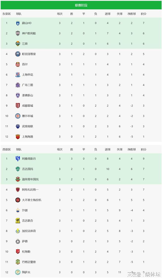 西亚区利雅得新月表现极其强势,豪取3连胜领跑积分榜,而吉达国民、迪拜青年国民和阿布扎比统一都是2胜1平的不败战绩,分列积分榜第二到第四位。此外,乌兹别克斯坦球队纳萨夫遭遇3连败,毫无疑问排名西亚区垫底。